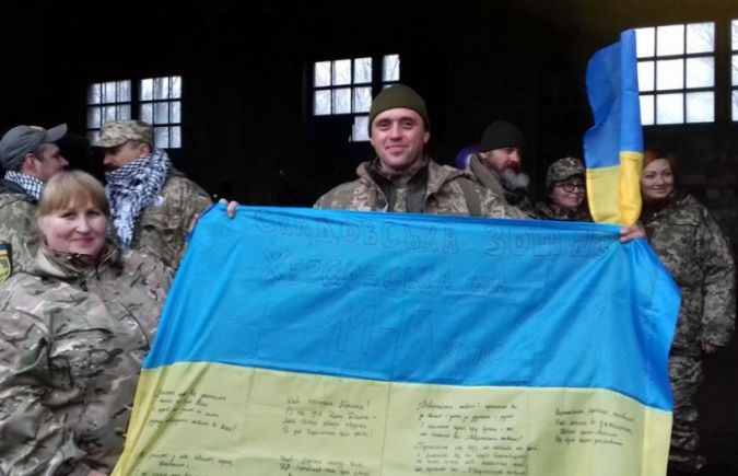 Волонтер передает искреннюю благодарность от военных детям Скадовска. Бойцы благодарят за подарки, продукты питания и сладости. Отдельную благодарность передает ученикам своей родной третьей школы ее бывший воспитанник. Дети передали ему и его собратьям флаг школы в надежде, что этот флаг будет защищать бойцов.