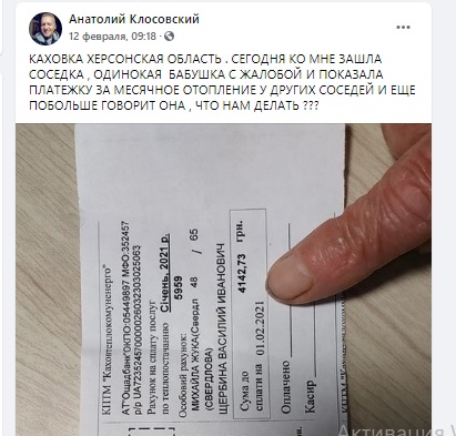 Квитанции за оплату на тепло продолжают шокировать жителей Херсона и области. Очередную "платежку" в соцсети опубликовал каховчанин Анатолий. "Ко мне зашла соседка - одинокая бабушка. Показала платежку за месячное отопление. У других соседей еще побольше. Говорит: что нам делать?", - рассказал он.
