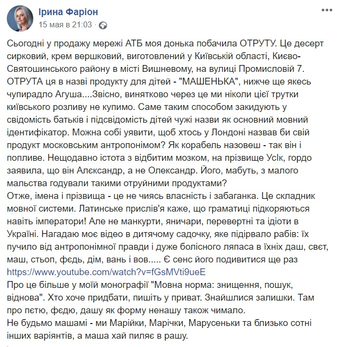 «Сегодня в продаже сети АТБ моя дочь увидела яд… Яд этот в названии продукта для детей - "Машенька", ниже еще какое-то чупирадло Агуша .... Конечно, исключительно из-за этого мы никогда эту отраву киевского разлива не купим», - написала экс-нардеп.