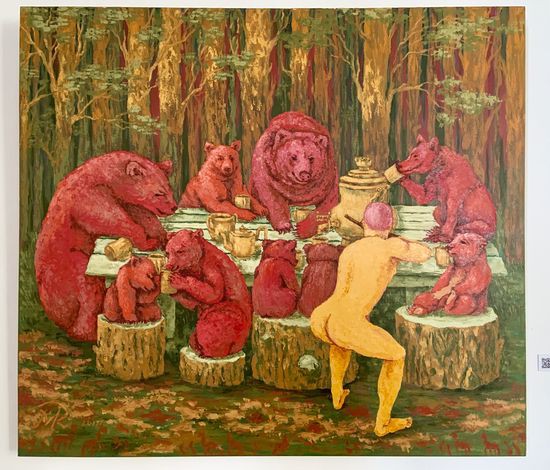 Выставка разделена на три зала: современные художники, музыкальный угол и зал Музея современного искусства, который действует в Херсоне уже много лет. Здесь представлена наивная живопись, видео-арт, цифровая живопись, разные эксперименты с материалами и формами. Актуальные в настоящее время защитные маски — тоже в стиле херарт.