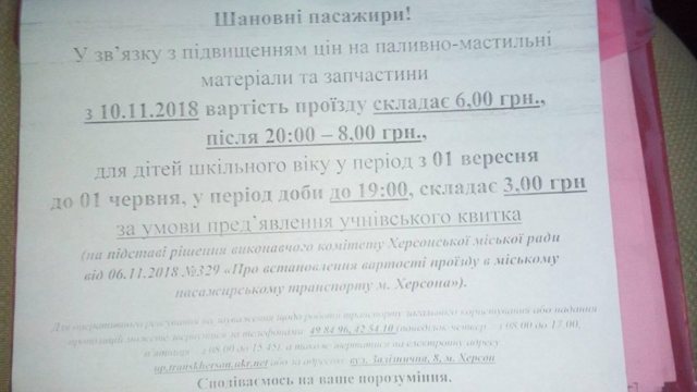 Вот такое объявление, размещенное в маршрутке, опубликовал в соцсети житель Херсона.