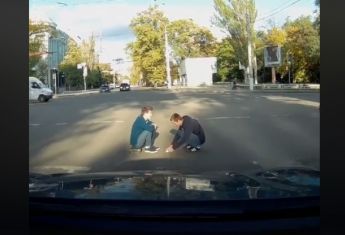 Двое парней вместе с другими пешеходами начали переходить дрогу, но на полпути сели и решили сыграть в карты.