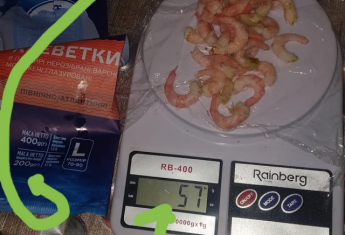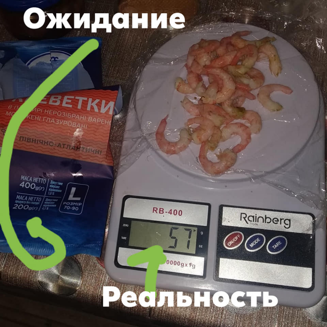 "Акция на креветки в глазури - 60 грн вместо 75 грн, - пишет херсонка Екатерина - 400 грамм всего, 200 грамм воды и 143 грамма остатков. Кто забыл купить воду и очистки - добро пожаловать".