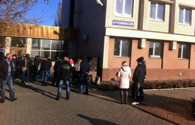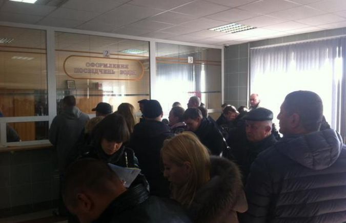 В здании бывшего Херсонского МРЭО выстроилась очередь. Некоторые херсонцы не поместились в холе и ждут на улице.
