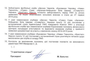 Если до 27 июня Буковина (Черновцы), Нива (Тернополь) и Кристалл (Херсон) не погасят задолженность перед ПФЛ по годовых заявочных и других обязательных денежных взносах, то будет рассматриваться вопрос об исключении этих клубов из состава ПФЛ.