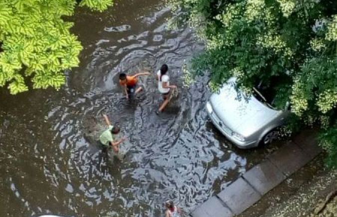 Для взрослых это неприятность, а для детей забава – они сняли обувь и бегали босыми ногами по искусственному «водоему». Разве можно упустить такой прекрасный случай порезвиться и попрыгать в огромных лужах!