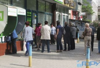 По-прежнему наблюдается серьезный ажиотаж неподалеку от банковских отделений. Например, чтобы попасть в Приват-банк, который продлил время работы в будние дни до 17:30 (в выходные «приватовцы» всё еще не работают), выстраиваются длинные очереди.