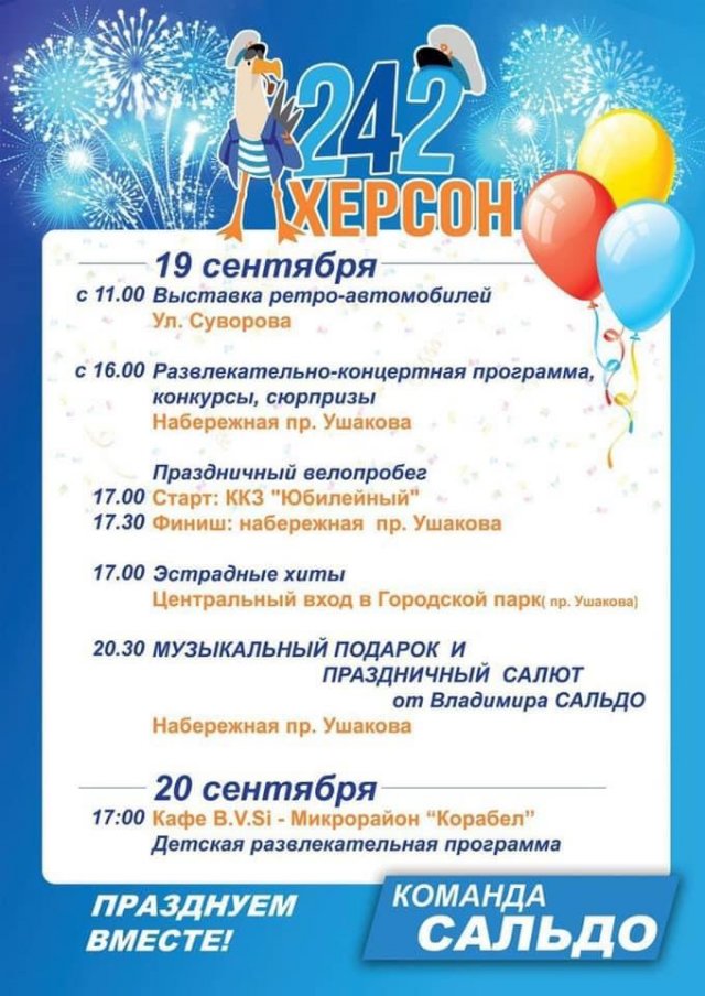 З 16-ї на набережнiй по проспекту Ушакова розпочнеться велика концертно-розважальна програма, де на прохання багатьох херсонцiв ми вiдродимо традицiю вiнчати свято великим салютом.