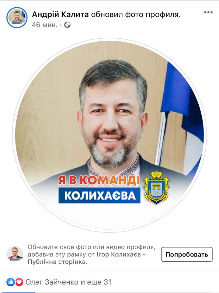 Сегодня он заставил всех своих депутатов... поставить в Facebook рамочку, которая сообщает счастливым избирателям, что их депутат в команде Колыхаева. Почти все депутаты уже сменили рамки.