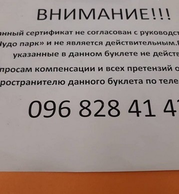 "Есть несколько акций по городу - карты такие большие распространяют с фишками там - купи один, второй в подарок и т.п. Был на боулинг, театр... я как-то обходила стороной. Но вот пришел в офис молодой человек и продавал такую карту на "Чудо Парк" (Фабрика). Для детей же. Купила я у него эту карту. А через пару недель пошли с малышкой в это парк, а там фото, гласящее, что данные сертификаты никоим образом не касаются администрации парка аттракционов и по вопросам компенсации обращайтесь туда. где их приобрели", - сообщает доверчивая мама.