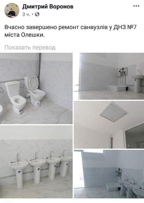 "Вовремя завершен ремонт санузлов в ДУЗ №7 (дошкольном учебном заведении) города Олешки", - говорится в подписи к посту.