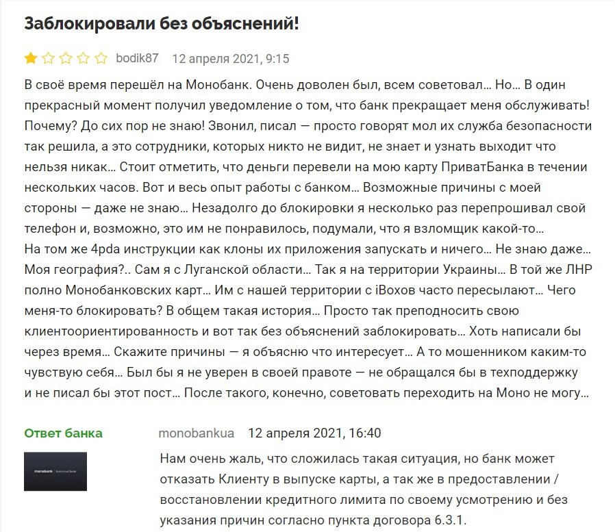 «Очень доволен был, всем советовал… Но… В один прекрасный момент получил уведомление о том, что банк прекращает меня обслуживать! Почему? До сих пор не знаю! Звонил, писал — просто говорят мол их служба безопасности так решила, а это сотрудники, которых никто не видит, не знает и узнать выходит что нельзя никак…» - рассказал бывший клиент monobank.