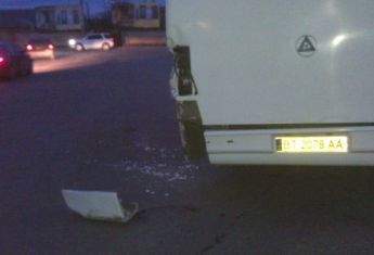 Прицеп зацепил автобус и сбил кусок бампера. Пассажирам пришлось пересаживаться на другие маршрутки, водитель остался ждать полицию.