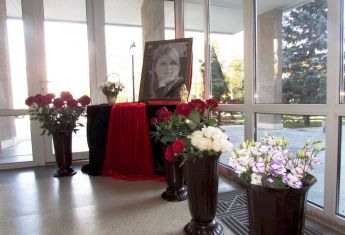 В вестибюле мэрии выставлено фото Гандзюк с траурной лентой, стоят цветы.