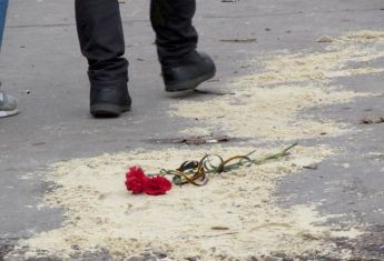 Сегодня пятна крови, которые остались на асфальте, засыпали песком. На месте аварии оставили цветы.