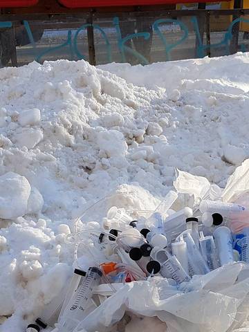 Как видно по фото, игл нет. Возможно, шприцы были обеззаражены, а после выброшены в мусорный контейнер, после чего их нашли бездомные и решили бросить на видном месте. Однако, эта ситуация говорит о необходимости повысить отвественность за утилизацию медотходов.