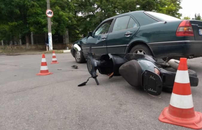 Сегодня, около 12:20 в Херсоне на перекрестке Украинской и Ладычука снова ДТП: столкнулись легковушка «Мерседес» и скутер «Хонда Дио».