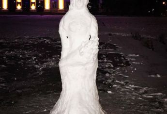 Вчера вечером перед зданием ОГА появилась снежная скульптура. Женщина держит в руках букет цветов - видимо, таким образом автор решил напомнить то, что весна - уже не за горами.