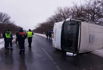 Неподалік курорту Коблево на Миколаївщині потрапила в аварію маршрутка Херсон-Одеса. На трасі автобус «Еталон» зачепив крижану пляму, й втратив зчеплення з асфальтом. Втримати його у рівновазі водій не зумів – транспортний засіб перехилився, й упав на бік, просто в сніг на узбіччі (дивись фото). «Посадка» виявилася досить м’якою – ніхто з подорожуючих у його салоні не загинув. Та постраждав 54-річний пасажир.