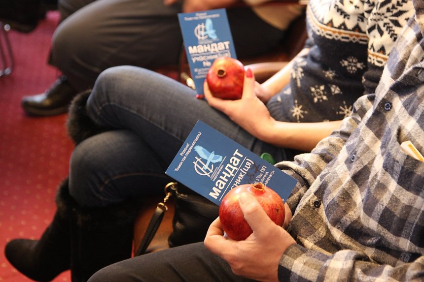 Как сообщается, делегаты съезда держали в руках гранаты (фрукты). Это отсылка к обвинению в адрес Савченко, одна из статей которого гласит, что она готовила обстрел Верховной Рады из гранатомёта.