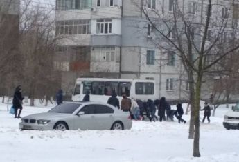 Маршрутные такси, пытаясь объехать пробку, застревают в снежных сугробах. Местные жители толпой толкали маршрутку, пытаясь помочь водителю выехать.