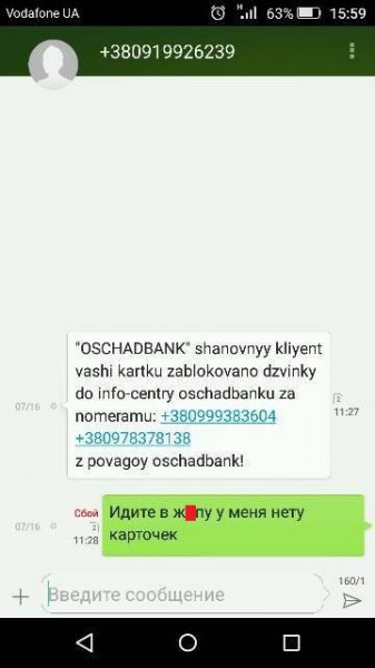 Некоторые херсонцы жалуются на смс-мошенников. Рассказывают, что получают смс сомнительного содержания. В них якобы "Ощадбанк" сообщает своим клиентам о блокировка их банковских карт и просит перезвонить по номерам телефонов.