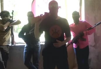 Видео снято в заброшенном здании. На нем запечатлены четверо мужчин. У них лица закрыты масками, в руках они держат оружие.