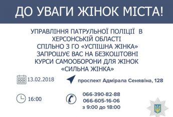 Приглашаем представительниц прекрасной половины херсонцев, а особенно тех, которые страдают от семейного насилия или были его жертвами, сообщается на странице патрульной полиции в соцсети. В программе курса кроме отработки приемов самообороны и хорошего настроения запланировано и общение с психологами. Приходите, будет интересно!