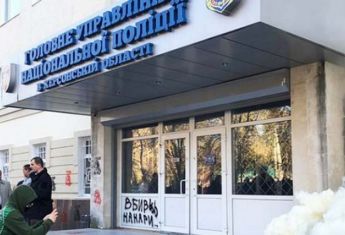 После этого файеры жгли и под зданием Главного управления Национальной полиции, что по улице Лютеранской (Кирова). И его стены, а также входные двери также расписали граффити.