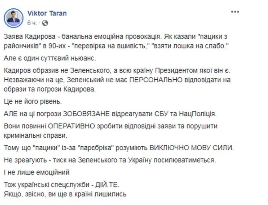 Украинский политолог Виктор Таран считает, что угрозы «личной мести» президенту Зеленскому, прозвучавшие в заявлении лидера Чечни Рамзана Кадырова, — это «банальная эмоциональная провокация».