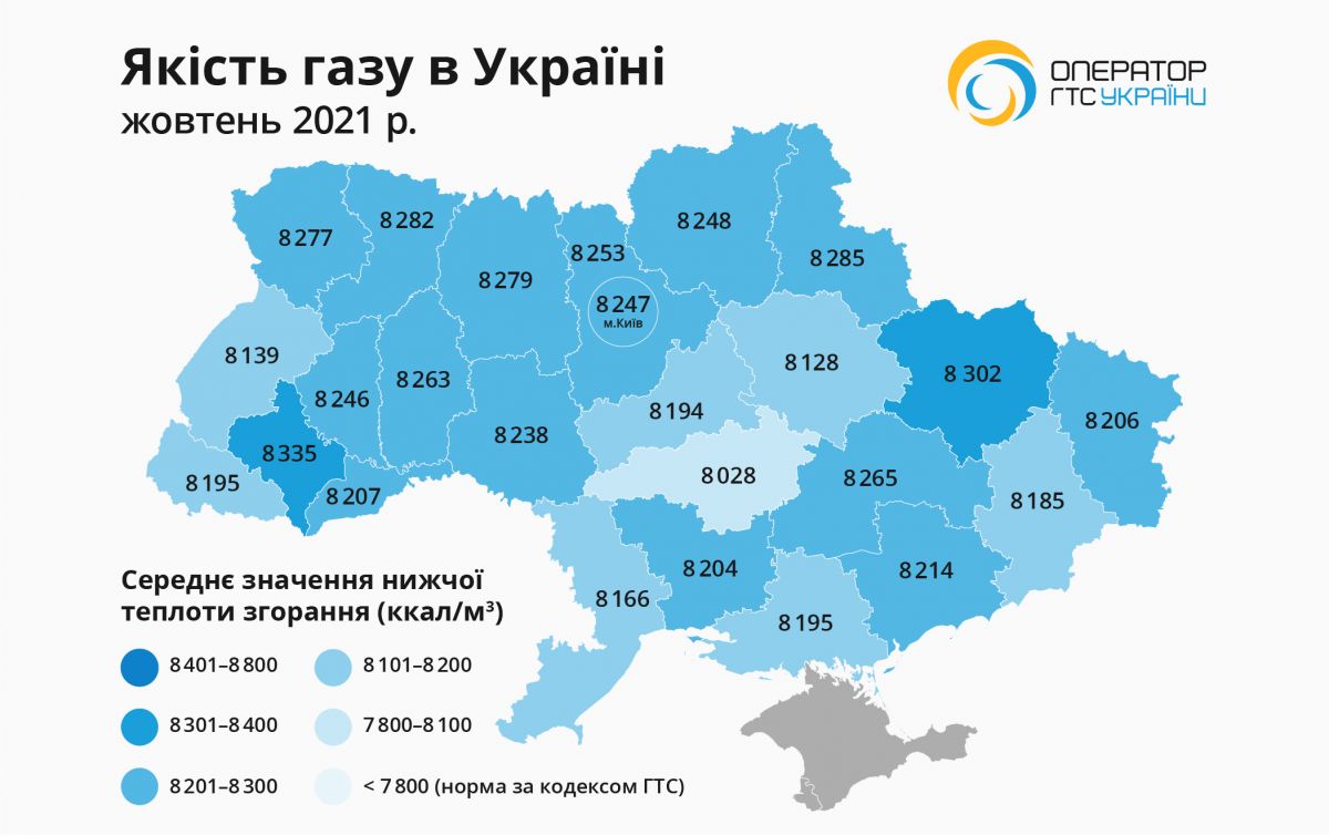 Согласно данным Оператора газотранспортной системы Украины, средневзвешенная теплота сгорания природного газа, подаваемого потребителям в октябре 2021 года, составляет 8223,24 ккал/м3 (при норме не ниже 7800 ккал/м3 в соответствии с Кодексом ГТС).