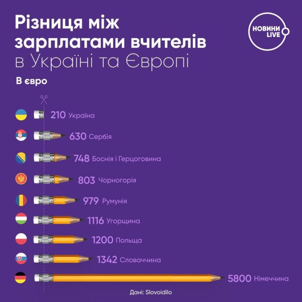Именно поэтому эксперты из "Новини.Live" поделились красноречивой инфографикой, в которой можно увидеть, сколько зарабатывают отечетвенные учителя и их европейские коллеги.