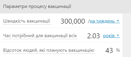 "По умолчанию мы указываем эти показатели на уровне вакцинации 300 тысяч вакцинаций на неделю и коэффициент охвата, по умолчанию 50% (не все, кто должен получить вакцину, сделают вакцинацию)", - говорит Валентин.