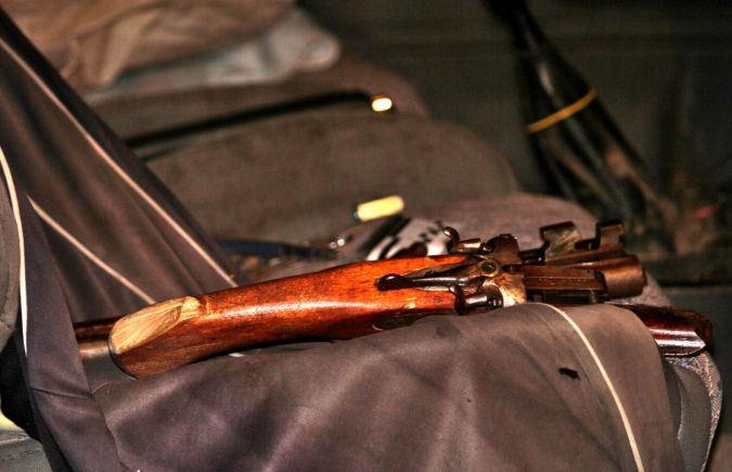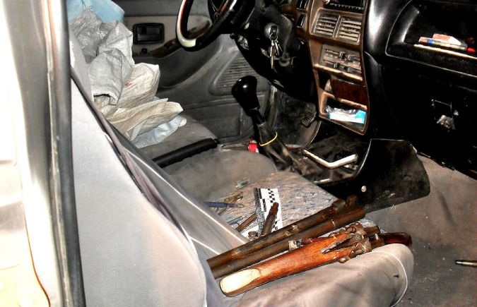 При обыске в автомобиле злоумышленников оперативники нашли заряженный обрез охотничьего ружья, переделанный для стрельбы патронами из пистолета ” Макарова” и товар, похищенный с места преступления.