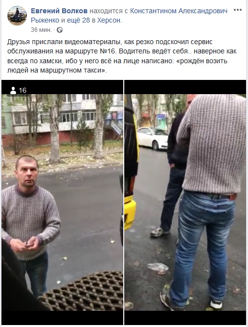 "Друзья прислали видеоматериалы, как резко подскочил сервис обслуживания на маршруте №16. Водитель ведёт себя.. наверное как всегда по хамски, ибо у него всё на лице написано: «рождён возить людей на маршрутном такси»", - подписал видео херсонец.