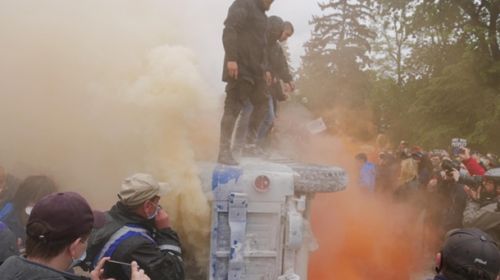 Под зданием Верховной Рады во время акции против Авакова протестующие перевернули автомобиль, символизирующий министра...