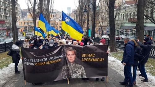 Протестующие несли с собой несколько больших баннеров, главный из которых – с первой леди Украины Еленой Зеленской в...