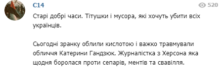 «Сегодня утром облили кислотой и тяжело травмировали лицо Екатерины Гандзюк. Журналистка из Херсона которая ежедневно боролась против сепаров, ментов и беспредела", - говорится в сообщении.