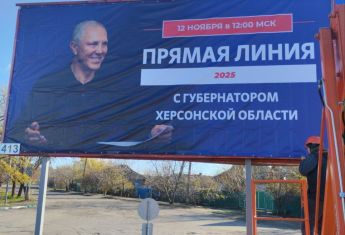 12 листопада на мешканців окупованого лівобережжя чекає «грандіозна» подія – «пряма лінія» з «губернатором» Володимиром Сальдо. Грандіозності їй намагаються надати самі окупанти, які безперестанку рекламують «лінію» на радіо і телебаченні, встановлюють білборди з анонсом (на фото – один з таких, встановлений в окупованому Верхньому Рогачику), анонсують її у соцмережах окупаційних адміністрацій.
