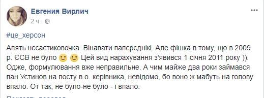 В социальных сетях заметили, что он как минимум лукавит, а как правило лжет : «Фішка в тому, що в 2009 р. ЄСВ ( ред. - Єдиний соціальний внесок ) не було. Цей вид нарахування з'явився 1 січня 2011 року. Одже, формулювання вже неправильне. А чим майже два роки займався пан Устинов на посту в.о. керівника, невідомо, бо воно ж мабуть на голову впало. От так, не було-не було - і впало».