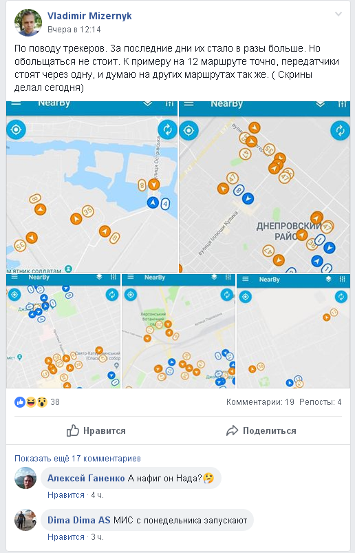 Сидоренко Анатолий: «Это всё конечно хорошо, трекеры шмекеры но проблема остается, в пятницу с ТРЦ"ФАБРИКА" в 20:00 уехать в сторону пед. института или парка славы уже не на чем, ни троллейбуса ни маршрутки, даже по 6 грн. Проезд поднялся а графика нет уже не говоря за состояния этих маршруток».
