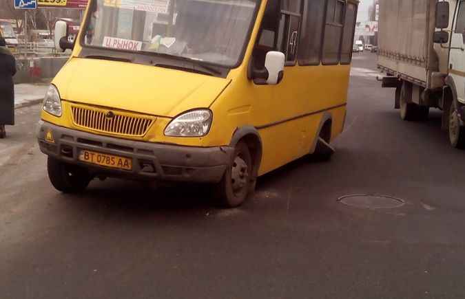 Сегодня около 9 утра на площади Павла Дубинды (район ХБК) в херсонской маршрутки отвалилось колесо. Это был маршрут номер 47 и он вез пассажиров.