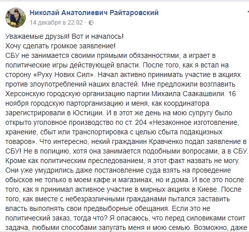 Ранее Николай Райтаровский сообщал, что в день официальной регистрации его как координатора Херсонской городской организации партии Михаила Саакашвили» на его супругу было открыто уголовное производство по ст. 204 «Незаконное изготовление, хранение, сбыт или транспортировка с целью сбыта подакцизных товаров».