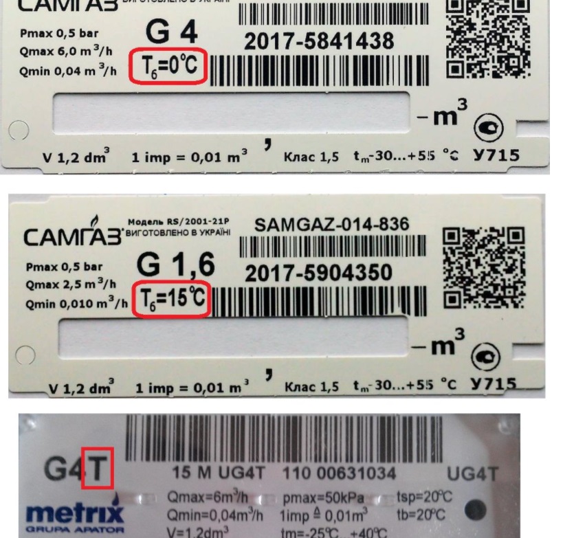 На фото показаны отметки, выделенные красным. Если на счетчике есть такие отметки, выделенные красным - "ТБ = 0°С" или "Тб = 15°С», или у типоразмера есть буква "Т", то вы владелец такого счетчика.