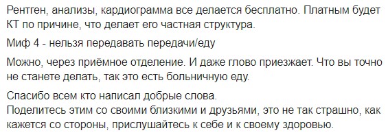 Миф 4 - нельзя передавать передачи/еду. Можно, через приемное отделение. И даже "Глово" приезжает. Что вы точно не станете делать, так это есть больничную еду.