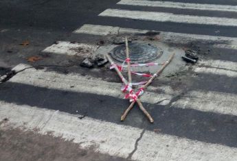 На ул. Суворова провели небольшой ремонт дороги - обновили полотно, укрепили коллекторный вход цементом. А чтобы машины не наехали на обновки поставили предупреждающий знак. Скрутив его из лежащих рядом палок и "яркой" ленты. Получилось не очень. Особенно учитывая, что вся конструкция упала и развалилась через час где-то. Так там и лежит.