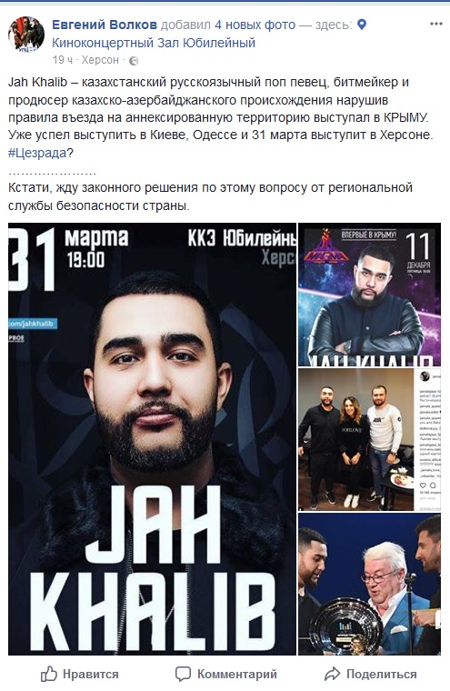 "Jah Khalib – казахстанский русскоязычный поп певец, битмейкер и продюсер казахско-азербайджанского происхождения нарушив правила въезда на аннексированную территорию выступал в КРЫМУ.