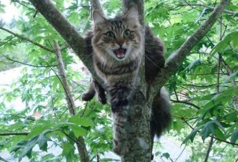 Белый пушистик зачем-то взобрался на самую верхушку дерева. а вот назад - не получилось...