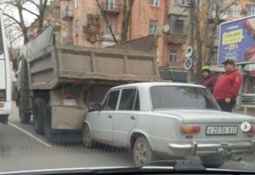 В Херсоне легковой автомобиль влетел под КамАз в районе площади Ганнибала.