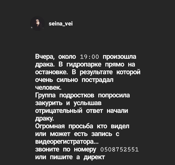Очевидцев просят позвонить по тел.: 0508752551 или написать в директ seina_vei.